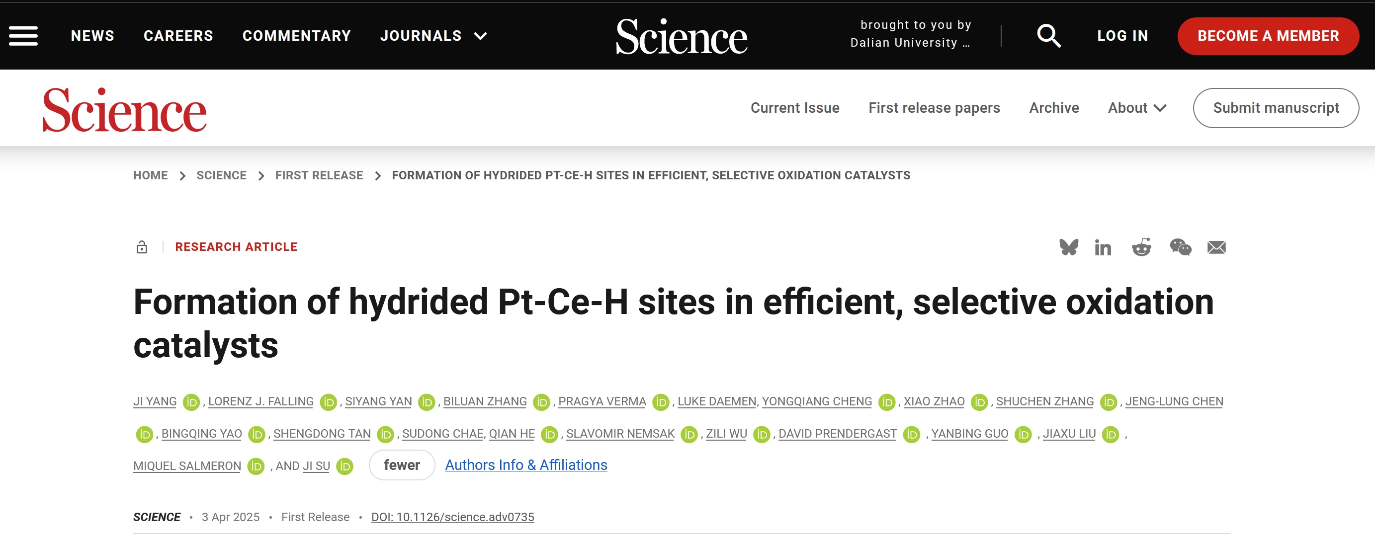 4月3日,化工学院刘家旭教授团队与劳伦斯伯克利国家实验室苏际(Ji Su)研究员、米克尔·萨尔梅隆(Miquel Salmeron)教授、大卫·普伦德加斯特(David Prendergast)教授及华中师范大学郭彦炳教授课题组合作在负载型催化剂研制方面取得突破性进展,研究成果“Pt-Ce催化剂中氢化位点的形成驱动高效选择性氧化”(Formation of hydrided Pt-Ce-H sites in efficient, selective oxidation catalysts)在《科学》(Science)上发表。该研究表明在设计高效负载型催化剂时,需要精确构建金属与载体之间的界面结构,并充分利用氢在催化过程中的独特作用。刘家旭教授为通讯作者之一,团队科研助理闫思杨工程师为共同第一作者。