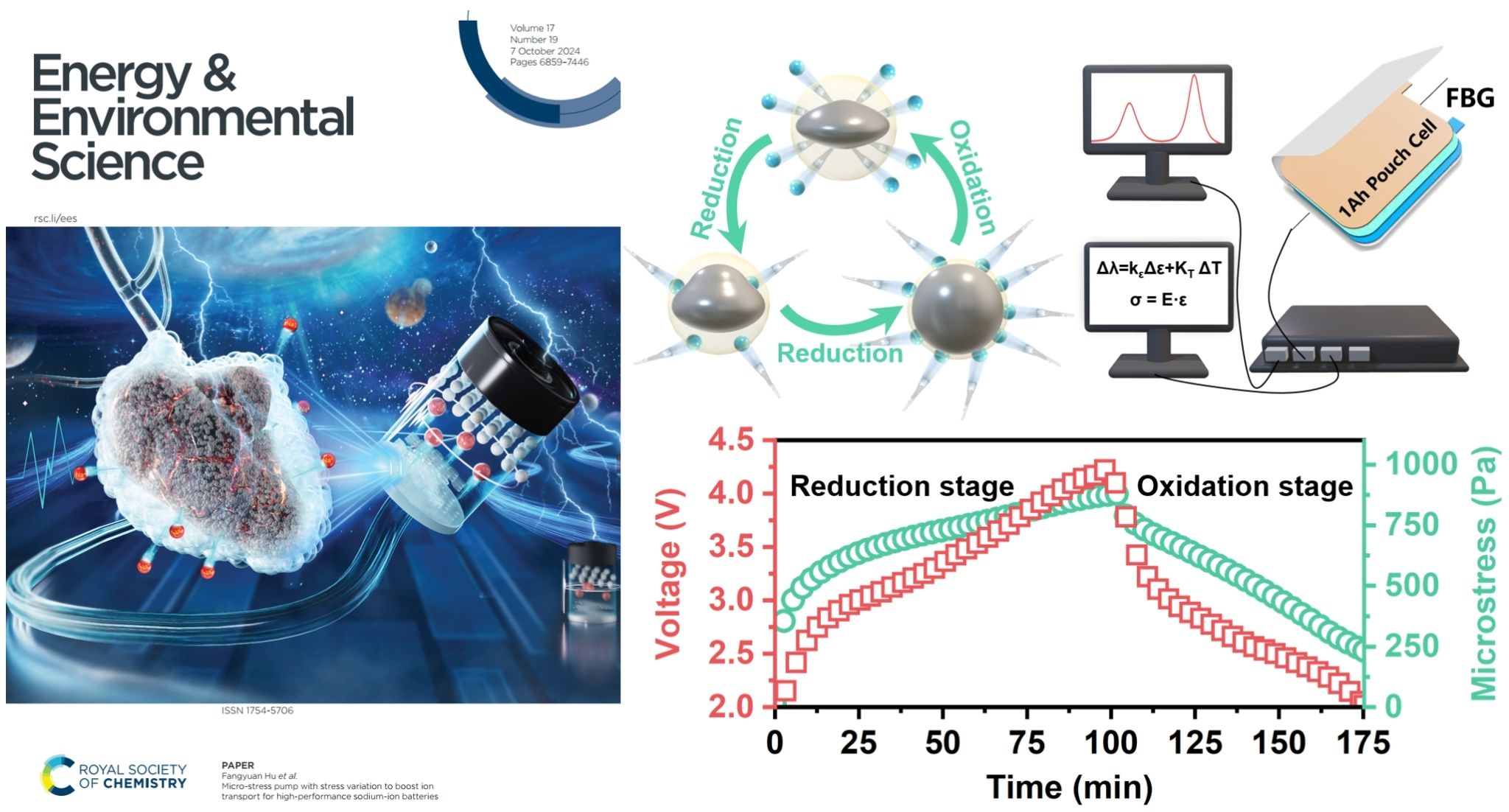 近期,材料科学与工程学院胡方圆教授在钠离子电池关键材料创制方面取得进展,揭示了电极电势诱导液态金属界面张力变化的构效关系,阐明了微应力场促进Na+传输的新机制,构筑了新型高性能的电化学储能器件。研究成果以“具有应力变化的微应力泵促进高性能钠离子电池离子传输”(Micro-stress pump with stress variation to boost ion transport for high-performance sodium-ion batteries)为题,在材料领域顶级期刊《能源与环境科学》(Energy & Environmental Science,影响因子:32.4)发表,并被遴选为当期的封面论文。