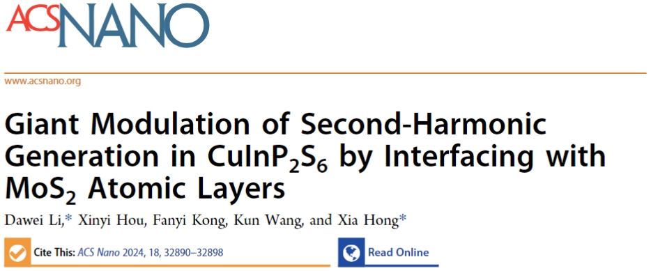 鉴于此,我校李大卫教授团队与美国内布拉斯加林肯大学洪霞教授团队合作,率先在CIPS及其与单层MoS2异质结构中观察到巨大且可调的二次谐波(SHG)响应。研究表明,CIPS在从少层到块体的厚度范围内均表现出强烈的SHG响应,且各向异性显著,表明其非中心对称结构的有效性。通过与单层MoS2形成异质结界面,实现了对CIPS中SHG响应的强调控,表明CIPS/二维半导体异质结构在非线性光学应用中的巨大潜力。通过结合偏振、温度和厚度依赖的SHG和光致发光光谱分析,揭示了CIPS/MoS2异质结构中SHG信号的调控机制主要来源于光吸收介导界面耦合,而非材料极性对称性,这一发现为理解和设计新型非线性光电材料与器件提供了新视角。相关研究成果以“单层MoS2界面诱导范德华层状铁电CuInP2S6二次谐波响应巨大调控”(Giant Modulation of Second-Harmonic Generation in CuInP2S6by Interfacing with MoS2Atomic Layers)为题发表在《美国化学学会纳米杂志》(ACS Nano)(2024,18,32890.影响因子:17.1),光仪学院硕士生侯心怡为(除导师外)第一作者,李大卫教授、洪霞教授为通讯作者。