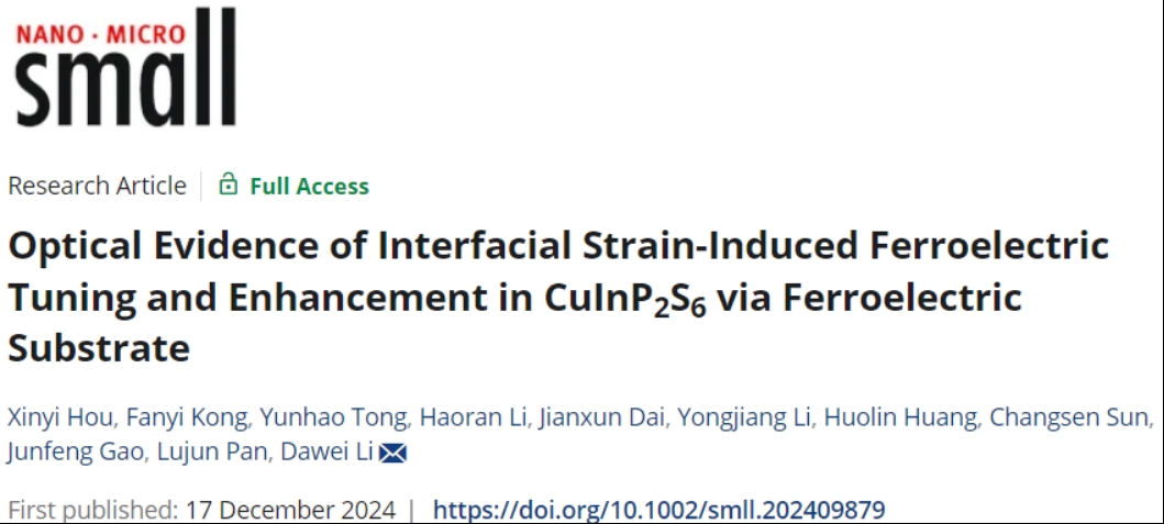 鉴于此,李大卫教授团队采用光致发光(PL)光谱、压电力显微镜(PFM)和密度泛函理论(DFT)计算相结合的方法,阐明了基于铁电衬底的界面应变诱导CIPS中铁电调控与增强。PFM测试发现,薄层CIPS纳米片形成了与PZT和P(VDF-TrFE)铁电薄膜相同的畴结构,表明通过铁电衬底增强了CIPS的极化取向。PL光谱结合DFT计算分析显示,与在一般衬底上CIPS相比,在铁电衬底上CIPS的PL发射峰出现了显著的红移(高达0.21eV),从而揭示了界面拉伸应变诱导的CIPS晶格变化。通过比较分析PZT和CIPS/PZT上的单层MoS2的PL光谱,证明了CIPS的极化取向与铁电衬底的极化取向是反向对齐关系。原位变温PL光谱研究表明,在铁电衬底上的薄层CIPS表现出增强的TC(>200℃)。相关研究成果以“基于铁电衬底的界面应变诱导CuInP2S6中铁电调控与增强的实验证明”(Optical Evidence of Interfacial Strain-Induced Ferroelectric Tuning and Enhancement in CuInP2S6via Ferroelectric Substrate)为题,发表在《微尺度》(Small)(2024,2409879.影响因子:13.0),硕士生侯心怡为第一作者,李大卫教授为通讯作者