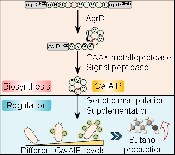 在梭状芽孢杆菌和葡萄球菌等革兰氏阳性细菌中,附属基因调节(Agr)系统负责自诱导肽(AIP)的生物合成。AIP前体由agrD基因编码,经过修饰转化为具有生物活性的环状结构,从而调节微生物的群体行为。这些群体行为包括生物膜形成、毒素产生、毒力因子合成以及孢子化过程,帮助微生物适应细胞内外环境中的挑战。尽管在了解AIP功能方面取得了进展,但我们对工业相关梭状芽孢杆菌如何处理这些前体以合成具有生物活性的AIP,以及AIP如何影响发酵性能的机制仍缺乏深入认识。